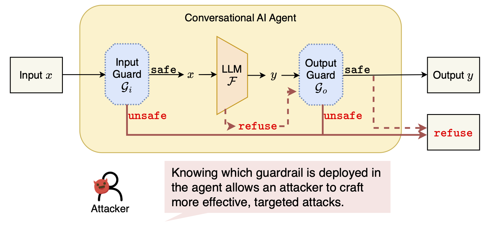 An attacker without this knowledge is like someone trying to break into a house without knowing the key, so that attacks are inefficient and unreliable. Once the guardrail is identified, however, guard-specific attacks become far more effective.